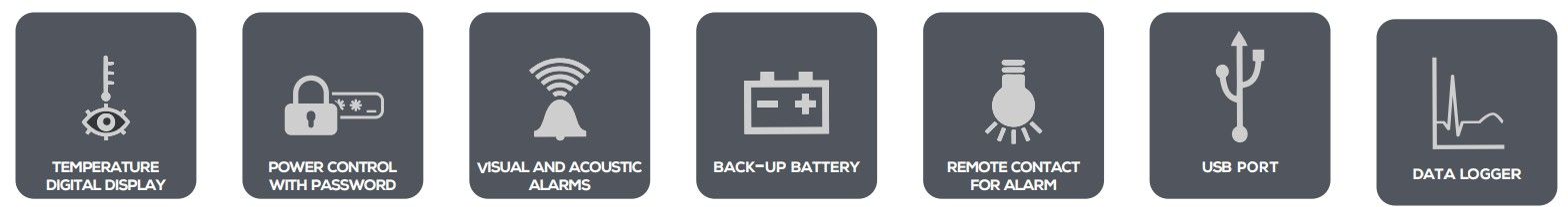 🔶 Contrôle électronique et sécurité - Système de contrôle par microprocesseur, avec affichage LED des paramètres suivants : Température interne, Température ambiante (sonde PT100), Tension d’alimentation,