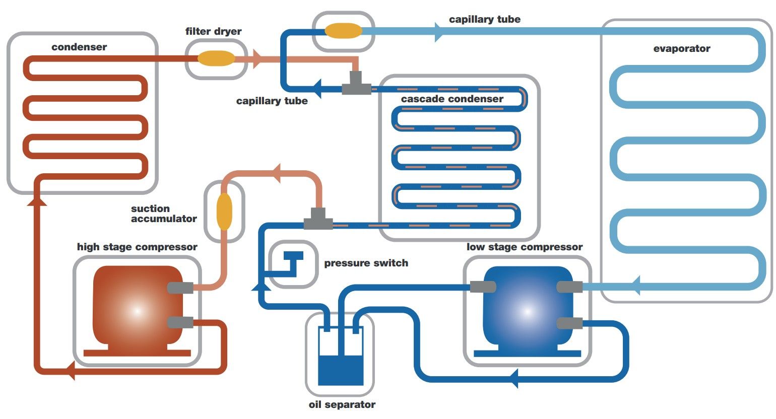 - Technologie cascade à deux compresseurs hermétiques Secop, haute performance pour basses températures.