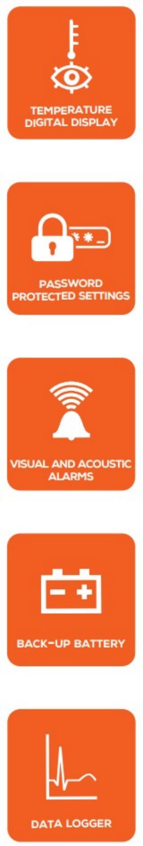 - Alarmes haute/basse température (seuil réglable), porte ouverte, coupure de courant (optionnel) et sonde défectueuse